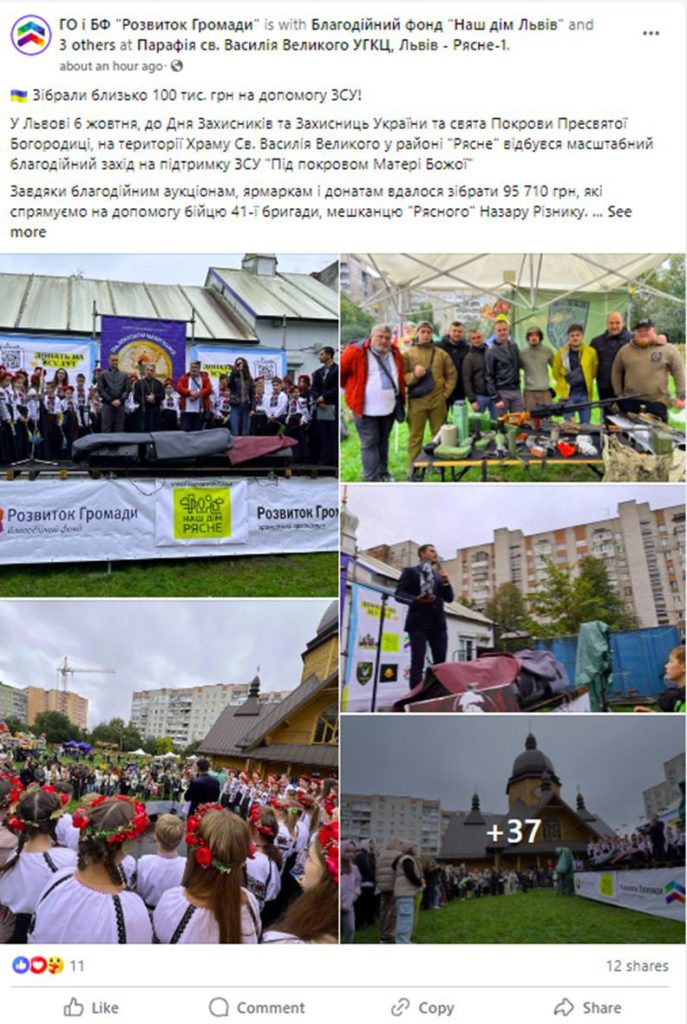 На благотворительном мероприятии под названием «Под покровом Матери Божьей» собирали средства для командования 41-й отдельной механизированной бригады ВСУ. Собранные 95 тысяч гривен (~ 2,3 тысячи долларов) поделили по-братски — почти 50 тысяч гривен (~ 1,2 тысячи долларов) забрал командир бригады, остальные пожертвования остались в распоряжении церковного руководства.