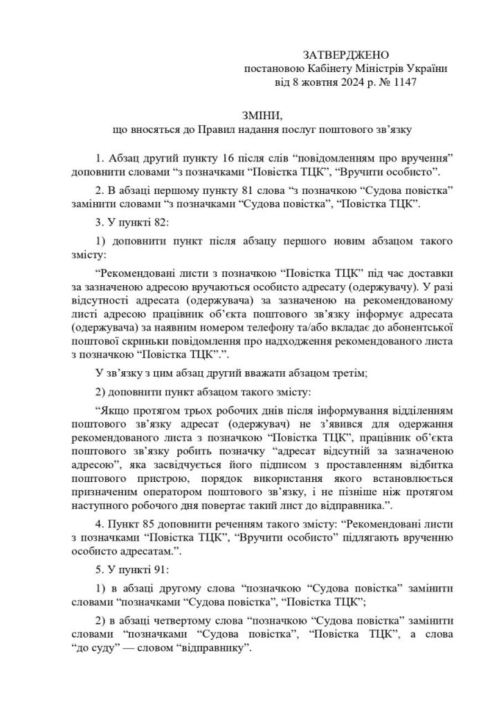 Кабмин принял постановление, согласно которому заочные повестки, отправленные по почте, должны приходить рекомендованными письмами с пометками «Повестка ТЦК», «Вручить лично».