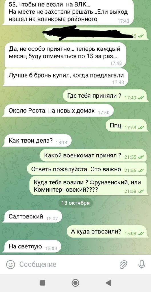 Фиксированной цены – нет. Одного харьковчанина выпустили из ТЦК за 5 тысяч долларов, и теперь каждый месяц он должен отдавать по 1 тысячи долларов военкому. Другой мужчина заплатил единоразово 2 500 долларов.