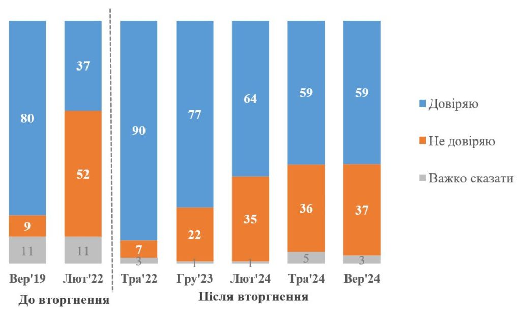 По состоянию на сентябрь 2024 года у Зеленского есть 59% доверия и 37% недоверия от украинцев.