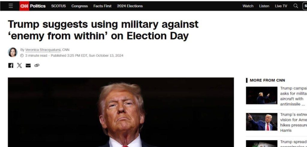 Трамп предложил воспользоваться армией в день выборов для борьбы с «внутренними врагами». В интервью CNN он подчеркнул, что его больше беспокоят «радикальные левые безумцы», а не хаос, создаваемый его сторонниками или иностранными факторами.