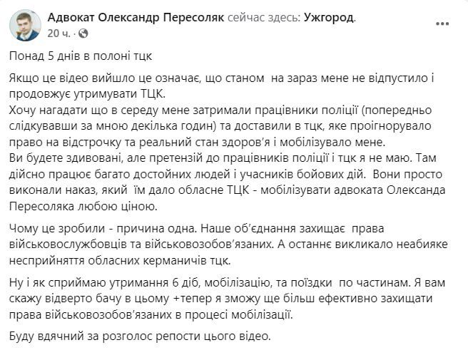 «Они просто выполнили приказ, данный им областным ТЦК, – мобилизовать адвоката Александра Пересоляка любой ценой. Почему это сделали – причина одна. Наше объединение защищает права военнослужащих и военнообязанных. А последнее вызвало незаурядное невосприятие областных вождей ТЦК», — считает адвокат.