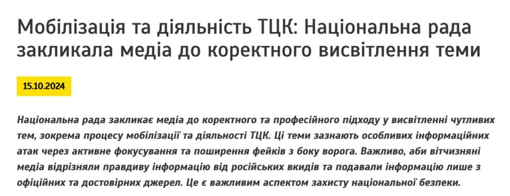 Национальный совет по телевидению и радиовещанию Украины призывает СМИ «корректно» освещать вопросы мобилизации и работы ТЦК. Он рекомендует «максимально осторожно» публиковать мнение украинцев, которые были насильно мобилизованы.