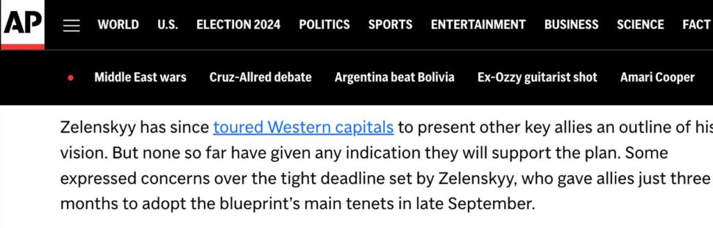 Зеленский «дал союзникам всего три месяца на принятие основных положений» своего «плана победы», пишет американское агентство Associated Press.
