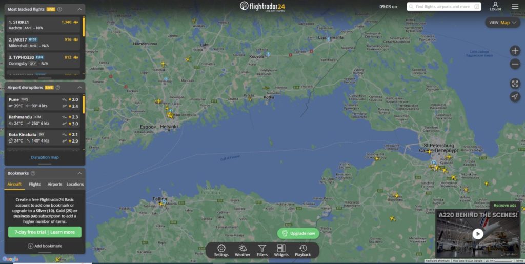 По информации сервиса, самолет-разведчик Boeing RC-135V Rivet Joint ВВС США взлетел в 05.47 по московскому времени из аэропорта Милденхолл в Великобритании, пролетел над территорией Нидерландов, Германии, Польши и затем сделал круг вдоль российской границы в Калининградской области, двигаясь над акваторией Балтийского моря и Литвой.