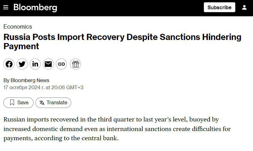 Согласно данным Центробанка, в третьем квартале 2024 года российский импорт достиг уровня прошлого года, несмотря на сложности, вызванные санкциями, говорится в материале. За этот период стоимость ввезенных товаров составила 76 миллиардов долларов, а объем импорта увеличился на 9% по сравнению с предыдущим кварталом. Это связано с ростом внутреннего спроса и укреплением рубля. Банк также отмечает, что в настоящее время наблюдается увеличение импорта в Россию из разных регионов мира.