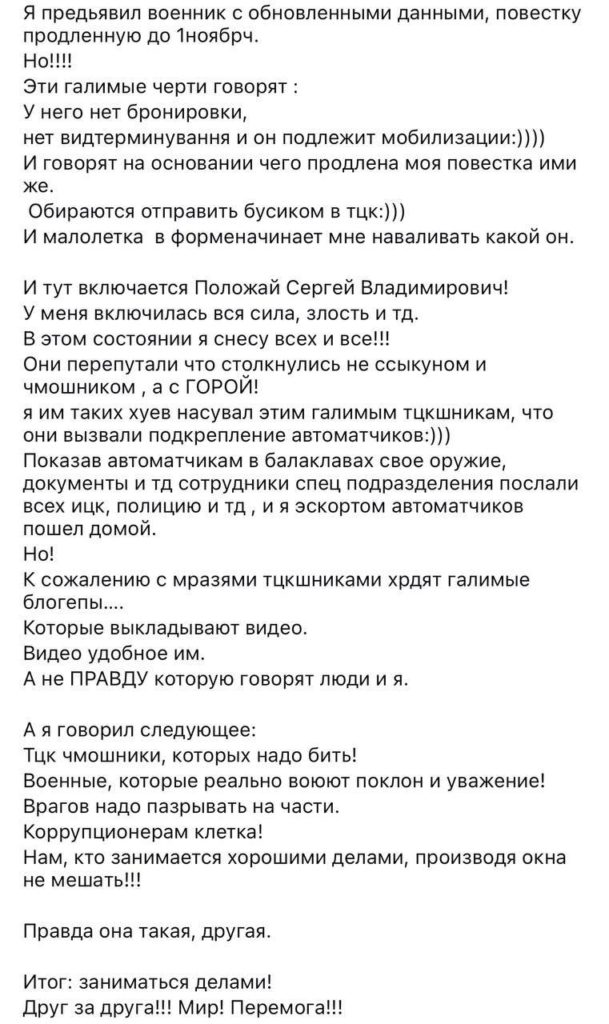 Напомним, конфликт произошел в Днепропетровске между сотрудниками ТЦК и Положаем. На опубликованных в сети кадрах он кричит военкомам: «Я гендиректор, где 1760 человек работают, а ты — солдат, п…дуй копай».