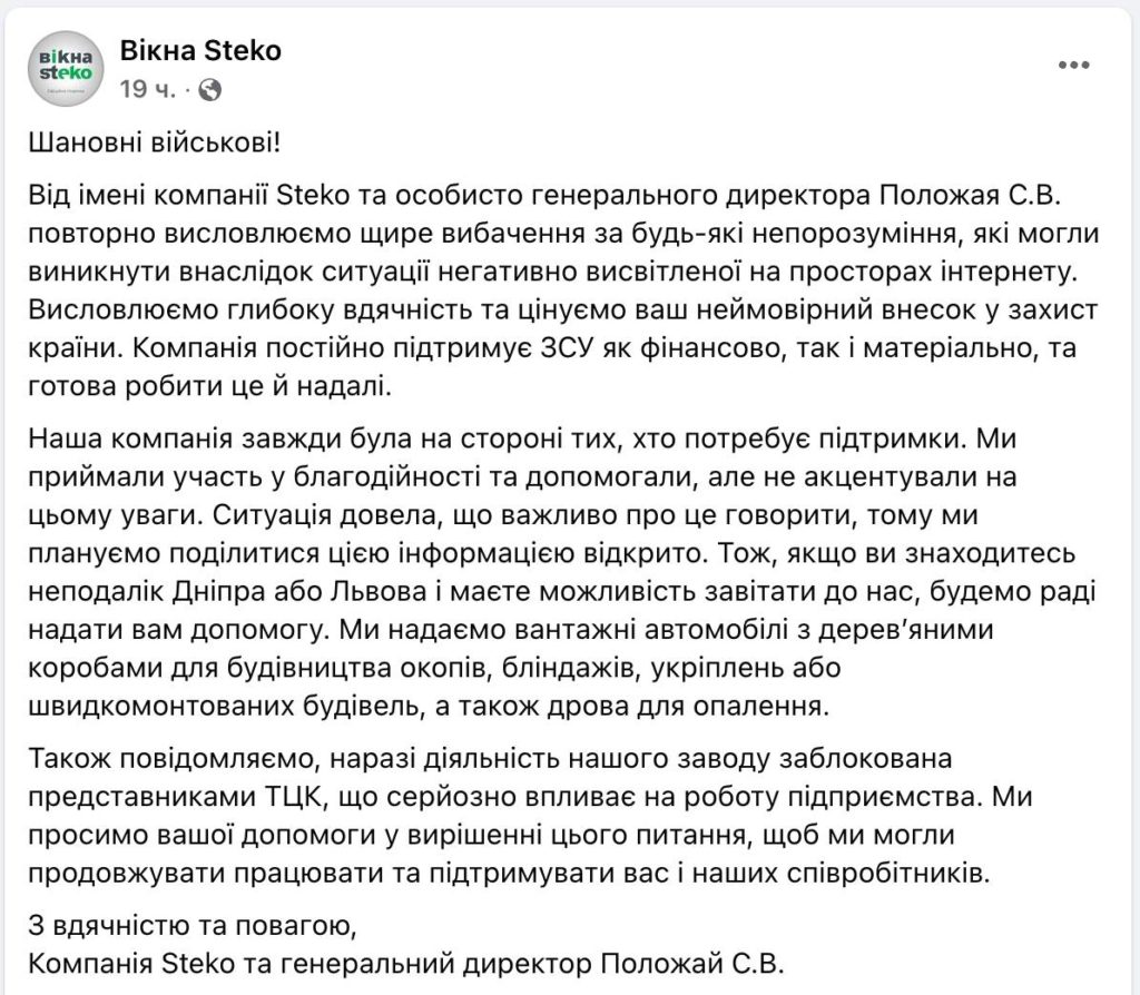 Производитель окон Steko, директором которой является Сергей Положай, заявил, что их работа была заблокирована военкоматом после инцидента с резкими высказываниями в адрес ТЦК.