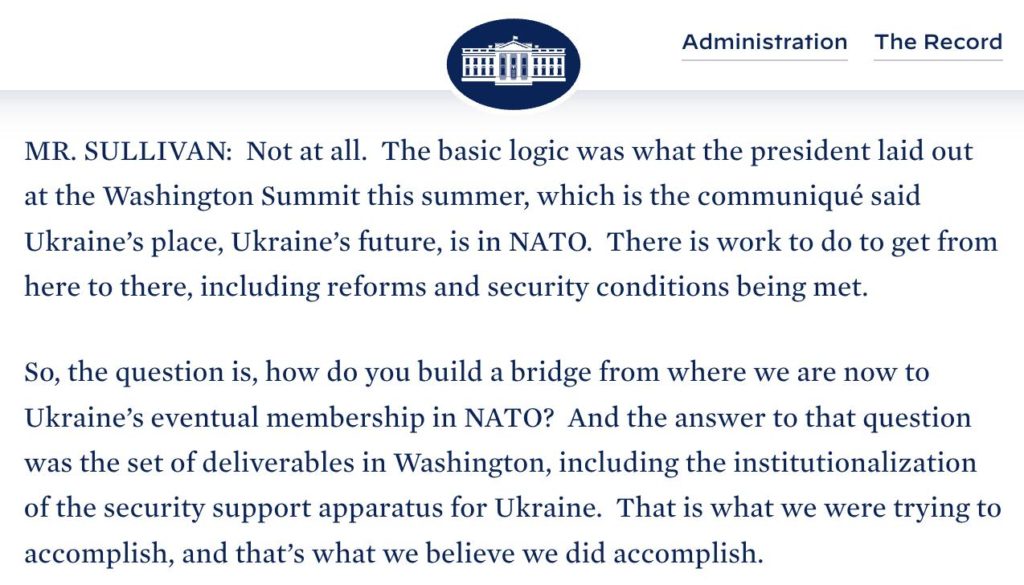 «Основная логика была в том, что президент изложил на Вашингтонском саммите этим летом, а именно в коммюнике, где говорилось, что место Украины, будущее Украины в НАТО. Нужно проделать работу, чтобы добраться отсюда туда, включая реформы и выполнение условий безопасности», — указал Салливан.
