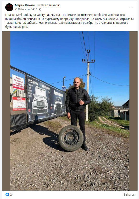 Украинские волонтеры отправили комплект колес военным ВСУ, но когда груз прибыл в батальон, выяснилось, что три из четырех колес исчезли.