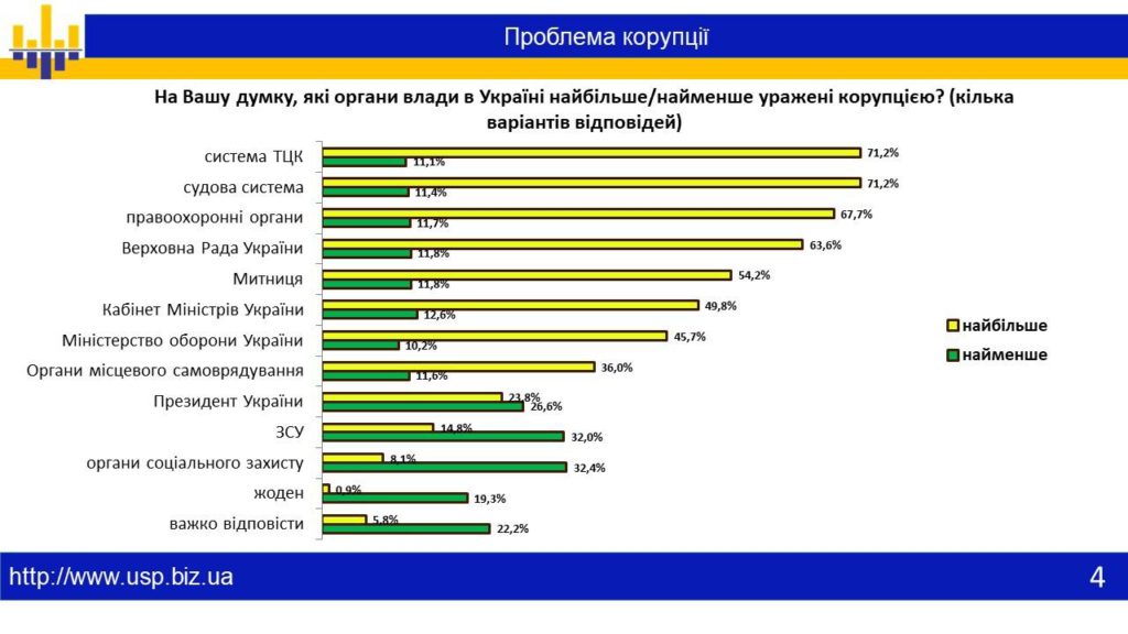 71,2% опрошенных считают, что наиболее поражены коррупцией система ТЦК и судебная система. По мнению 32% респондентов, меньше всего коррупции в ВСУ. Столько же уверены, что меньше всего взяточников в органах социальной защиты (32,4%).