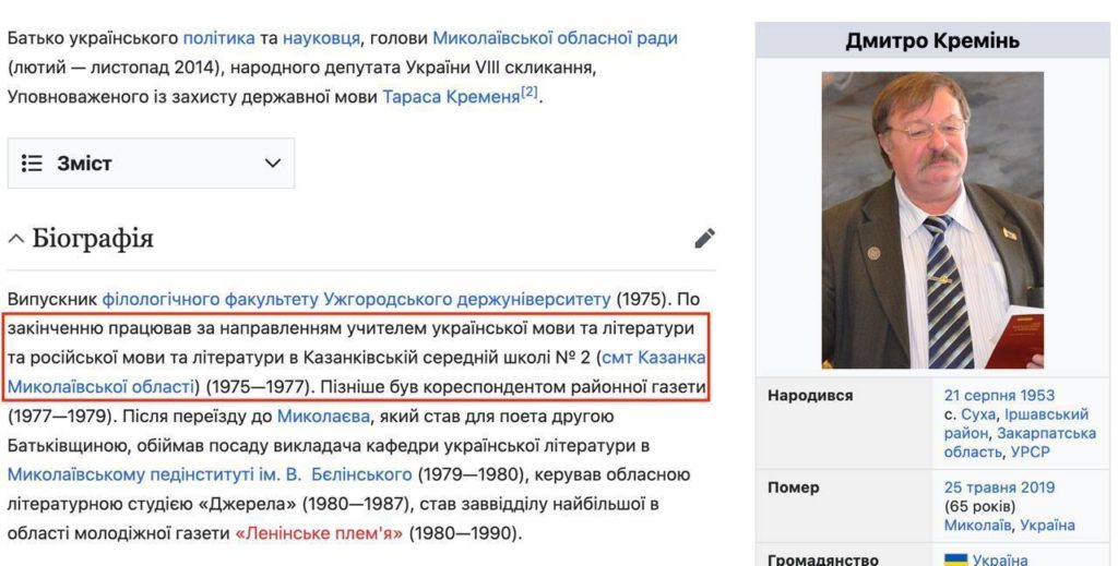 После этого пользователи обратили внимание на то, что в биографии его отца в Википедии указано, что Дмитрий Кремень работал преподавателем как украинского, так и русского языков в одной из школ Николаевской области.