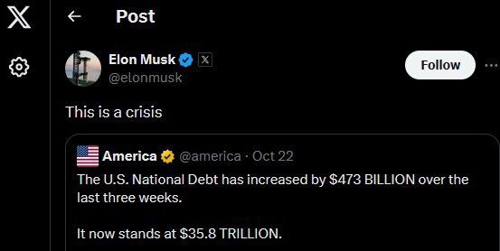 Ранее Илон Маск заявил , что США становятся банкротом из-за процентных платежей по госдолгу.