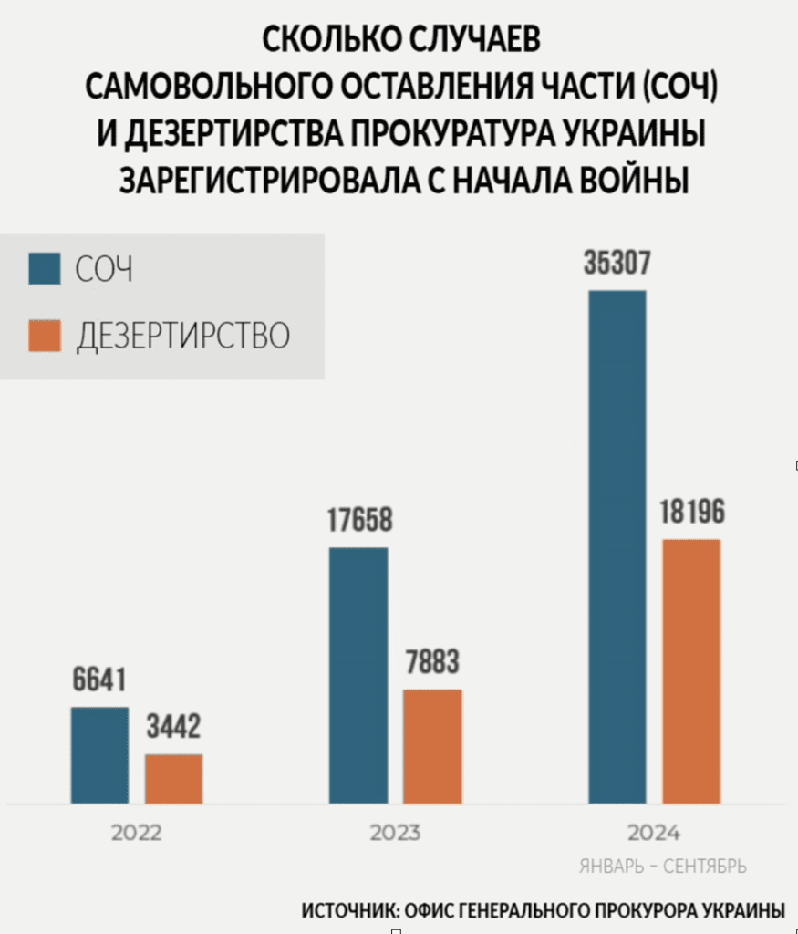 По данным УП, со ссылкой на Офис генпрокурора Украины, число случаев самовольного оставления части (СОЧ) и дезертирства в Вооруженных силах Украины за 2024 год резко возросло. За январь-сентябрь 2024 года прокуроры зафиксировали 35307 случаев СОЧ и 18196 фактов дезертирства. Суммарно уже за период с января по сентябрь 2024 года фактов СОЧ и дезертирства насчитывается 53503. Что в пять раз больше, чем за весь 2022-й год (было 10 083 случаев) и более чем в два раза больше показателей всего 2023 года (25541 случай СОЧ и дезертирства). По данным Офиса генерального прокурора Украины, за январь-сентябрь 2024 зарегистрировано почти в четыре раза больше дезертирства, чем за аналогичный период прошлого года. Всего в течение 2022-2024 годов СОЧ и дезертирства составило 89127 случаев.