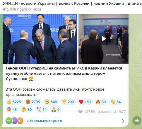 «Эта ООН совсем сломалась, давайте уже что-то новое организовывать», — так крупные украинские масс-медиа комментируют кадры с саммита БРИКС в Казани.