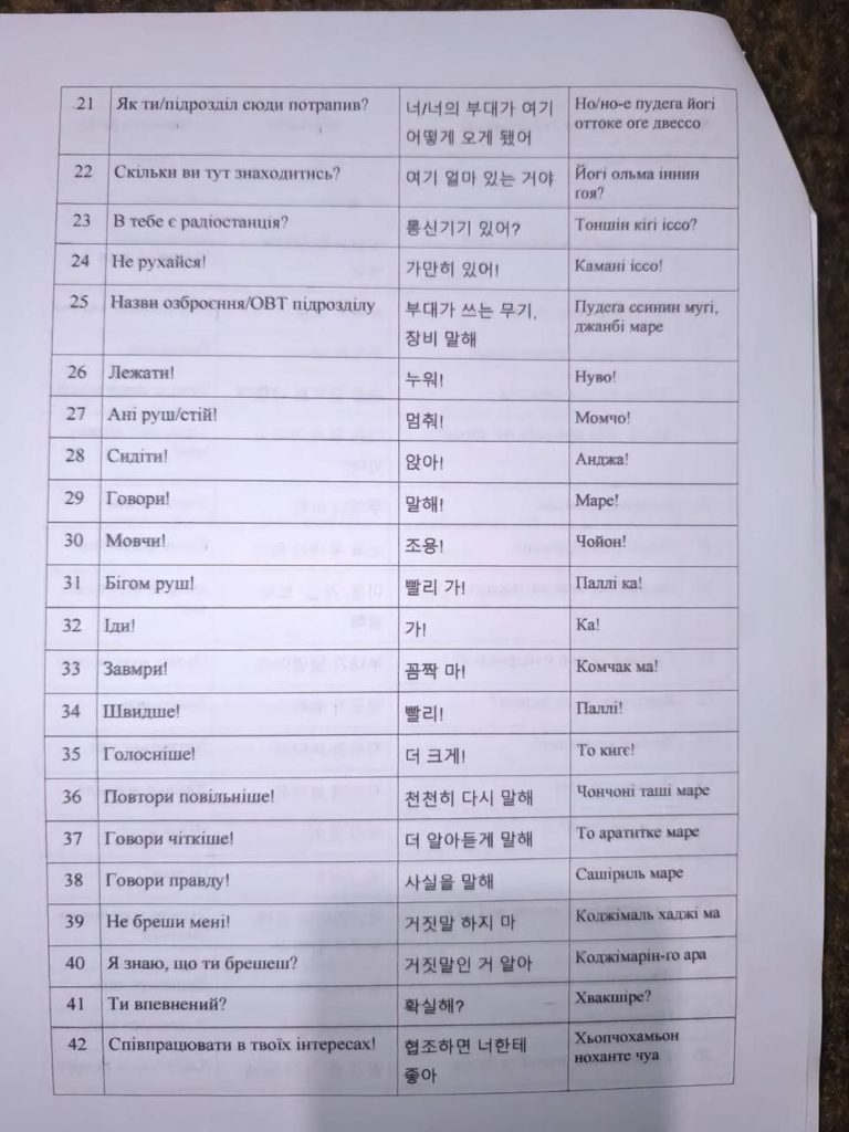 В ожидании предполагаемого прибытия северокорейских солдат украинским военнослужащим начали раздавать методички с фразами на корейском и украинском языках. Документ публикуют российские военные Telegram-каналы.