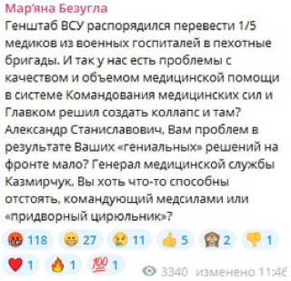 «Александр Станиславович, Вам проблем в результате Ваших «гениальных» решений на фронте маловато? Генерал медицинской службы Казмирчук, вы хоть что-то способны отстоять? Вы командующий медсил или «придворный цирюльник?» – прокомментировала ситуацию нардеп.