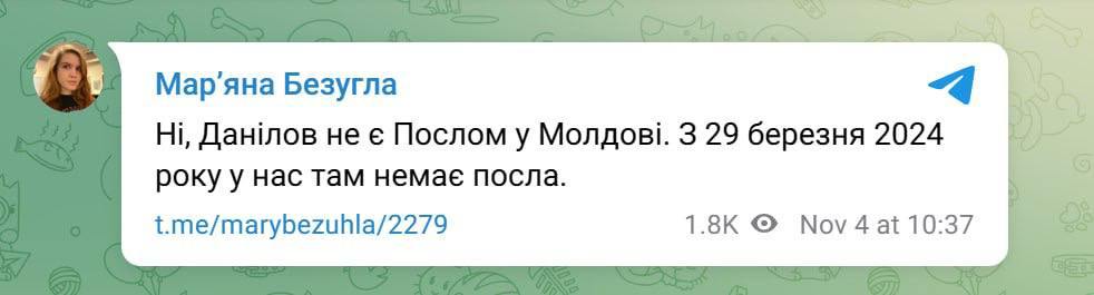 «Хорошо, что в Молдове победила проевропейская кандидатка, досадно, что у нас там до сих пор нет посла. Нет, Данилов — не посол в Молдове. С 29 марта 2024 г. у нас там нет посла», — написала Безуглая.