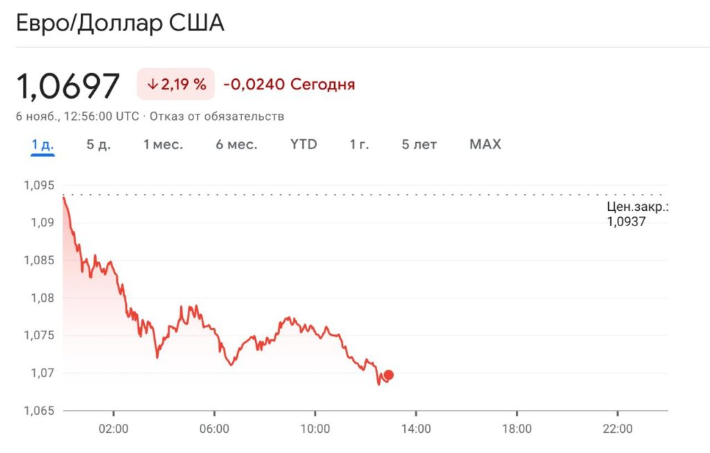 На фоне новостей о победе Дональда Трампа в президентских выборах США евро упал по отношению к доллару и стоил днем уже 1,0697.