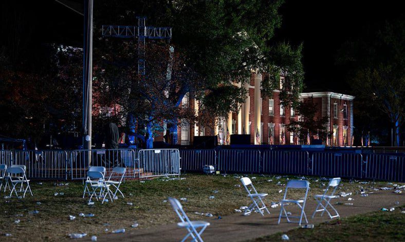 Западные СМИ публикуют фото с несостоявшейся вечеринки Камалы Харрис. На фото видны заброшенные стулья и флаги США.