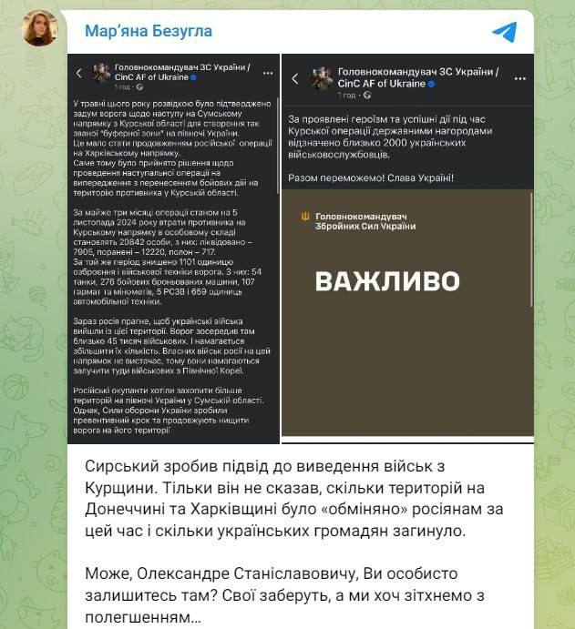 Как сообщила народный депутат Безуглая, главнокомандующий ВСУ своими публикациями о героизме в Курской области постепенно готовит украинцев к информации об отступлении.