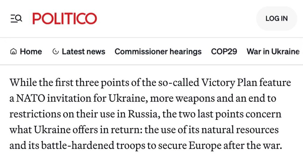 По информации Politico*, это — использование природных ресурсов Украины и опытных войск, прошедших через боевые действия, для обеспечения безопасности Европы после окончания войны.