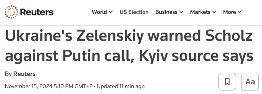 Как сообщили представители правительства Германии, Шольц во время телефонного разговора «призвал к окончанию вооруженного конфликта на Украине и переговорам с Зеленским». При этом канцлер ФРГ заявил, что он «будет поддерживать Украину столько, сколько необходимо».