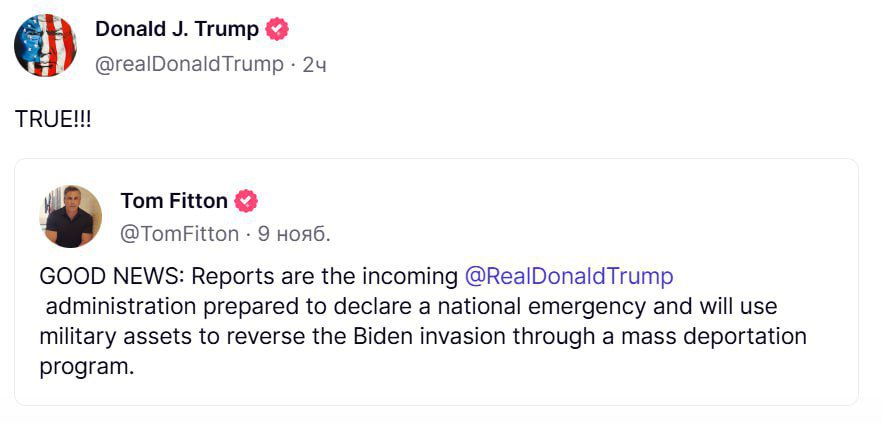 «Сообщается, что новая администрация Трампа готова объявить чрезвычайное положение в стране и задействует военные ресурсы, чтобы остановить вторжение Байдена посредством программы массовой депортации».