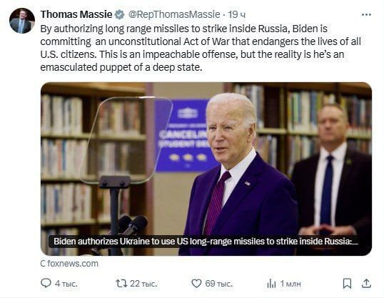 «Разрешив атаковать ракетами большой дальности Россию, Байден совершает неконституционный акт войны, который ставит под угрозу жизни всех граждан США», — написал на своей странице в соцсети конгрессмен.