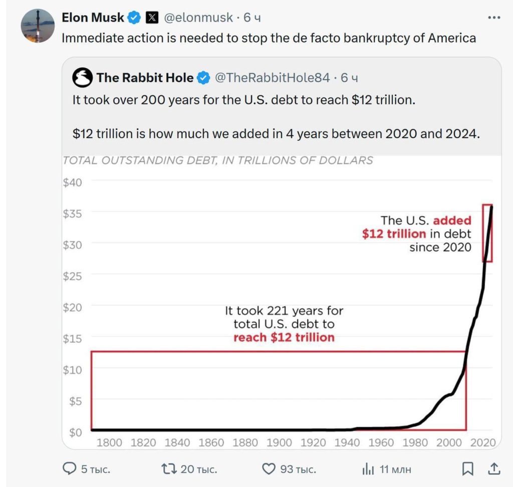 «Необходимы немедленные действия, чтобы остановить фактическое банкротство Америки», — прокомментировал предприниматель.