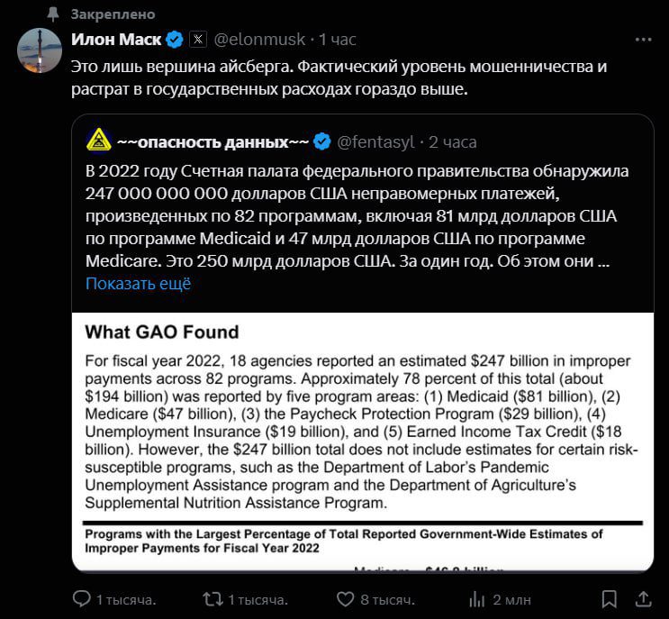 Американский миллиардер Илон Маск прокомментировал информацию о том, что Счетная палата федерального правительства выявила неправомерные платежи на сумму 247 миллиардов долларов США.