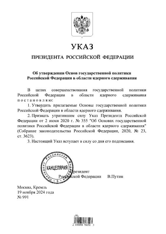 Указ президента России от 2 июня 2020 года «Об Основах государственной политики Российской Федерации в области ядерного сдерживания» утратил силу.