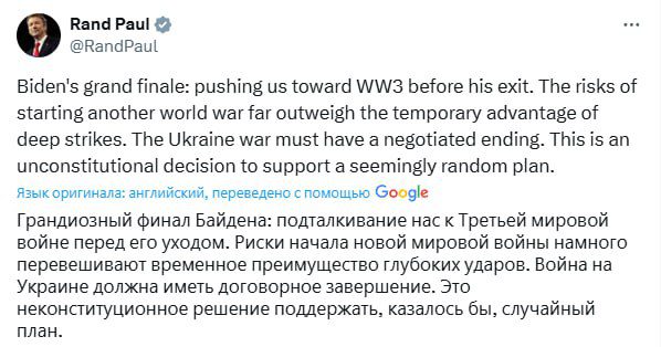 Решение президента США Джо Байдена разрешить Украине наносить удары ракетами ATACMS по территории России противоречит американской конституции и ставит страну под угрозу третьей мировой войны. Об этом написал в соцсетях сенатор Рэнд Пол.