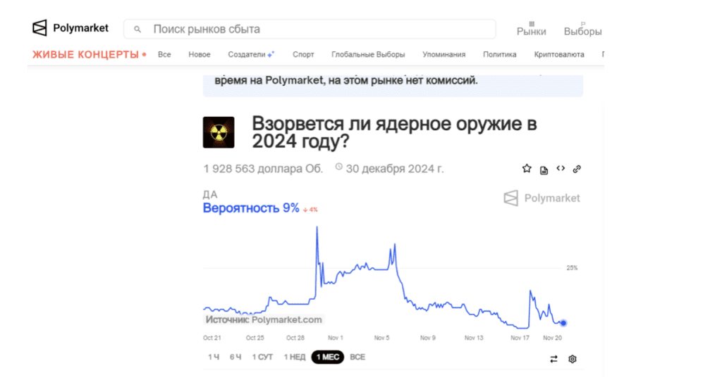 Polymarket 20 ноября опубликовал событие, предусматривающее использование Россией ядерного оружия до конца года. Букмекеры указывают, что условием выполнения этого события должна стать детонация ядерного устройства во время атаки, однако оно исключает испытание ядерного оружия. Пока Polymarket оценивает шансы в около 9 %, что Россия использует ядерное оружие до 31 января 2024 года.