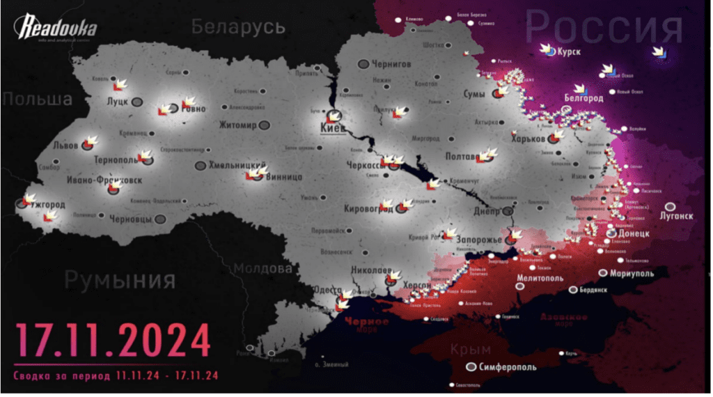 3. 16 ноября, по сообщениям украинской стороны, было обнаружено и сопровождено 210 воздушных целей — 120 ракет и 90 БпЛА: одну гиперзвуковую корабельную ракету 3М22 Циркон, восемь аэробаллистических ракет Х-47М2 Кинжал, 101 крылатую ракету Х-101, Калибр, одну баллистическую ракету Искандер-М, четыре крылатые / противорадиолокационные ракеты Х-22 / Х-31П, пять управляемых авиационных ракет Х-59 / Х-69, 90 ударных БпЛА/дронов неустановленного типа. В воздух было поднято семь стратегических бомбардировщиков Ту-160, 16 Ту-95МС, два дальних бомбардировщика Ту-22М3, пять истребителей Су-34, четыре Су-27, 10 МиГ-31К, а также четыре корабля, оснащенные крылатыми ракетами.