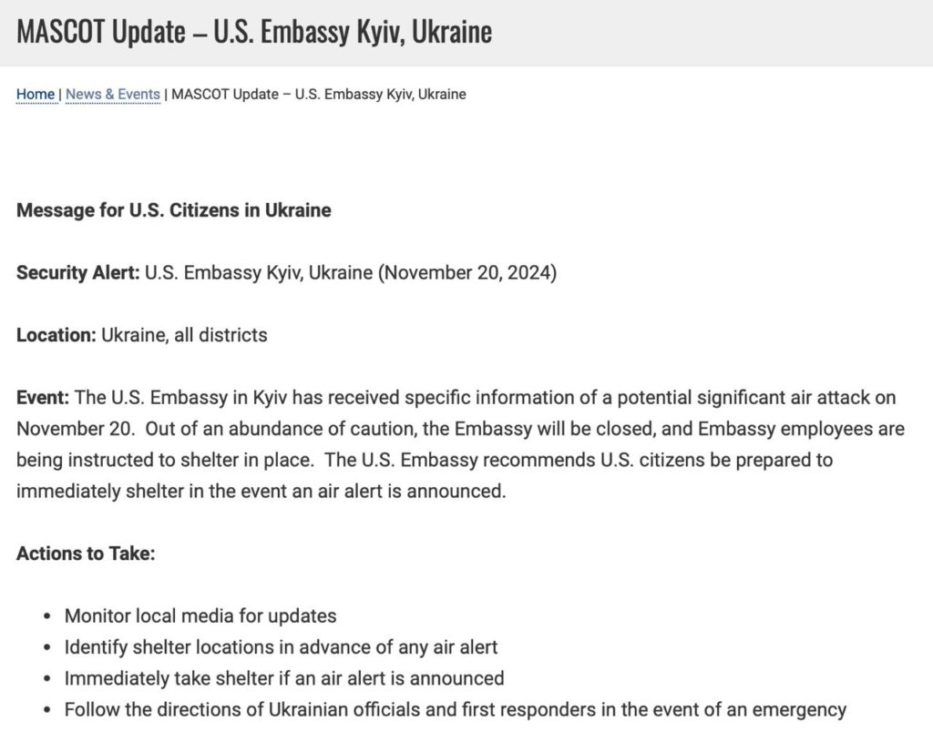 Напомним, что американская разведка сообщила посольству США в Киеве информацию о «значительной воздушной атаке» 20 ноября, после чего дипведомство было закрыто.