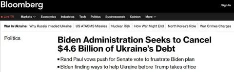 Уходящая администрация американского лидера Джо Байдена уведомила Конгресс США о намерении списать долги с Киева на сумму 4,65 миллиарда долларов, сообщает агентство Bloomberg.