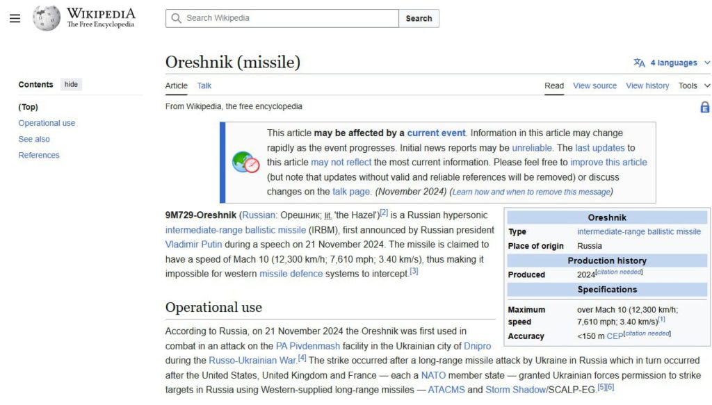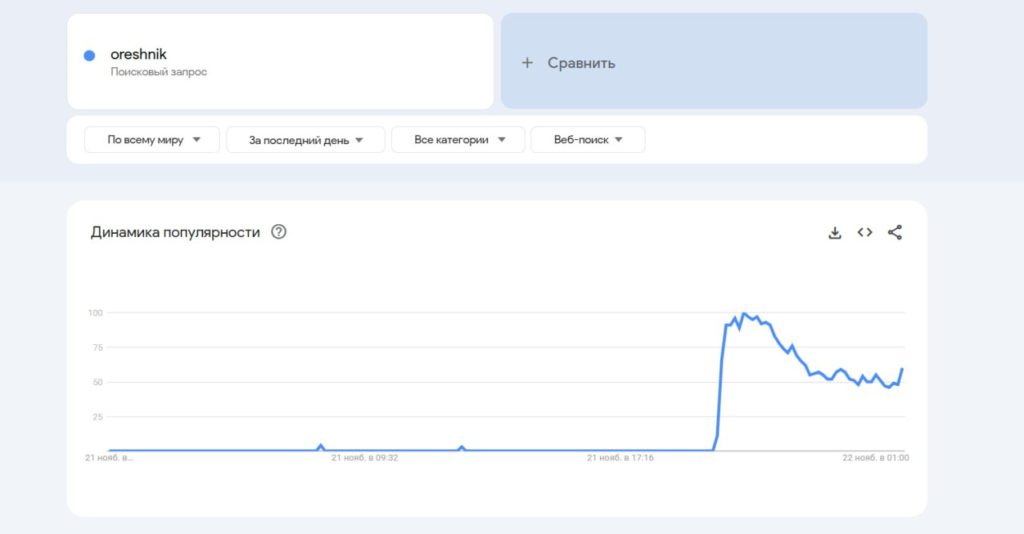 Запрос «Oreshnik» в поисковой системе Google достиг ста баллов из ста по динамике популярности.