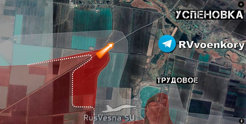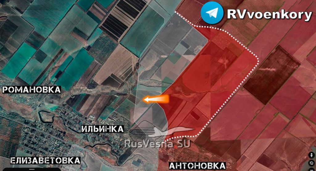 К северу от Антоновки российские войска продвинулись вдоль ряда лесопосадок на участке шириной до 2,95 км и глубиной до 1,4 км. Бои продолжаются в направлении Ильинки. Наступление продолжается в сторону Успеновки, включая действия из района населенных пунктов Дальнее и Трудовое.
