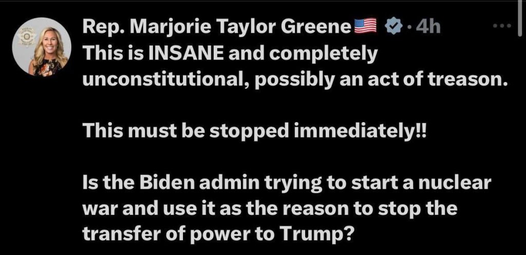 Конгрессвумен задалась вопросом, не пытается ли Байден таким образом начать ядерную войну и использовать это как повод для приостановки передачи власти Трампу.