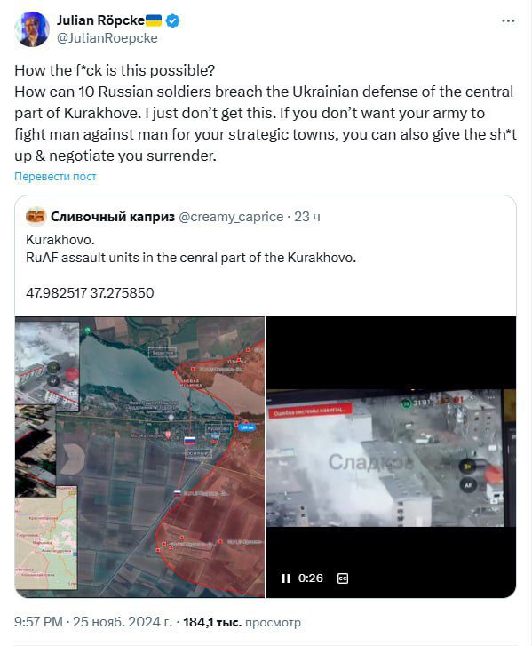 «Как, черт возьми, это возможно? Как десять российских солдат могут прорвать украинскую оборону в центральной части Курахово?», — вопрошает Рёпке.