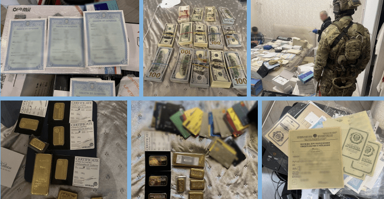 В ходе обысков во Львове, Киеве и Одессе были изъяты более 11 тысяч бланков документов, 2,5 кг золота, около 110 тысяч долларов, 50 тысяч рублей и компьютерное оборудование.