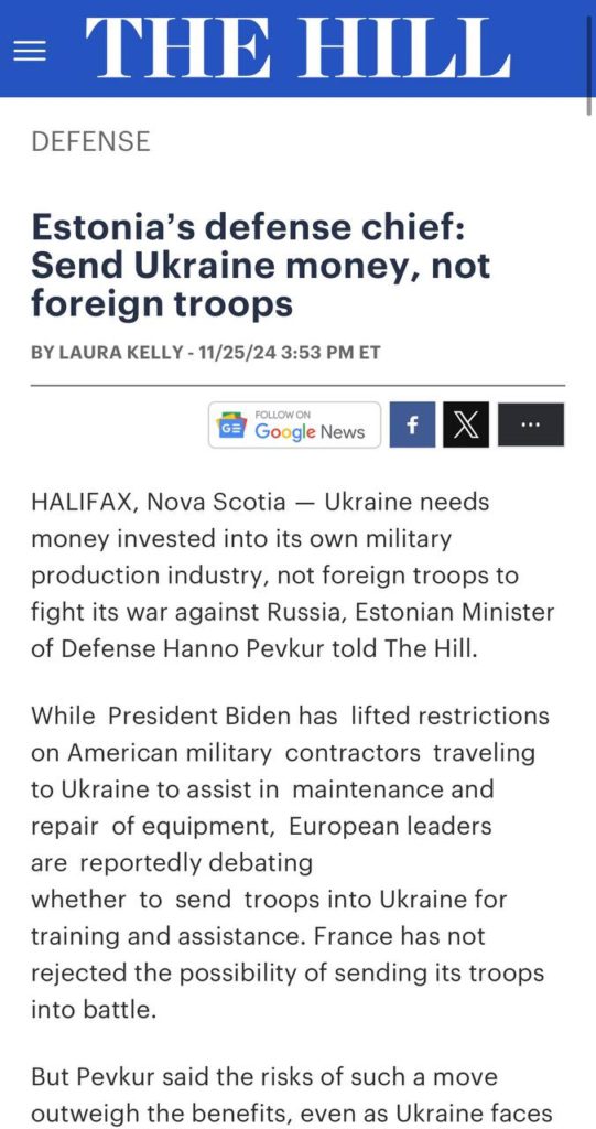 «Европейские лидеры, согласно сообщениям, обсуждают, отправлять ли войска на Украину для тренировки и помощи. Риски от такого шага перевешивают преимущества, несмотря на то что Украина сталкивается с нехваткой личного состава и борется за поддержание боевого духа», — пишет издание Hill по итогам общения с Певкуром на полях Международного форума по безопасности в Галифаксе.