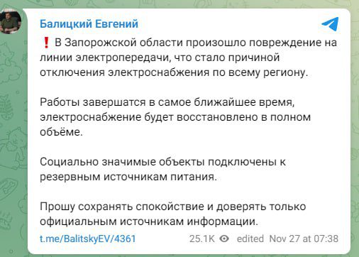 Балицкий обратился к жителям Запорожской области и попросил их доверять только проверенной информации и сохранять спокойствие.