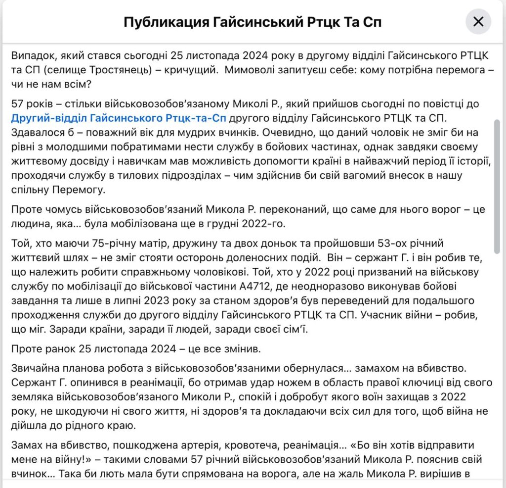 В Тростянце Винницкой области 57-летний мобилизованный мужчина нанес ножевое ранение сотруднику Территориального центра комплектования.