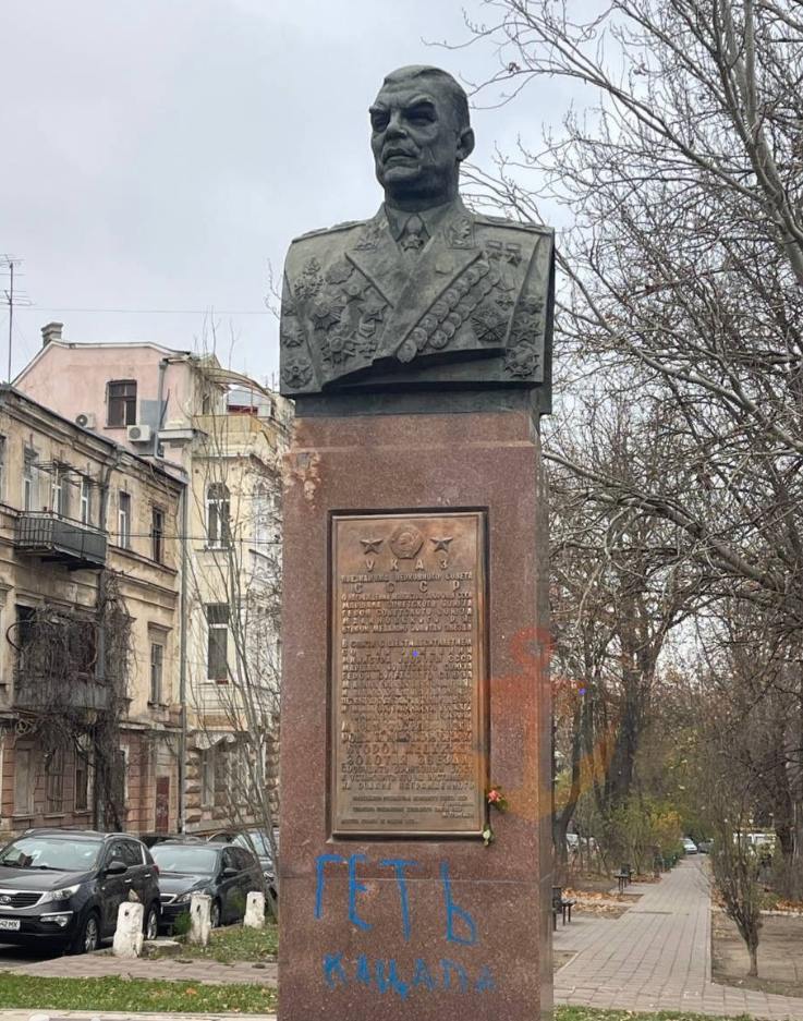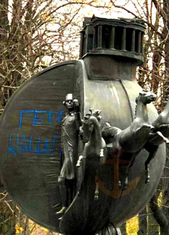 На этот раз вандалы написали «Геть кацапа» на бюсте Маршалу Советского Союза Родиону Малиновскому, а также на памятнике Апельсину, на котором изображен российский император Павел I.