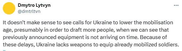 «Не имеет смысла призывать Украину снизить возраст мобилизации, предположительн для того, чтобы призвать больше людей, когда мы видим, что ранее объявленное оборудование не поступает вовремя. Из-за этих задержек у Украины не хватает оружия для оснащения уже мобилизованных солдат», — приводят заявление Литвина журналисты.