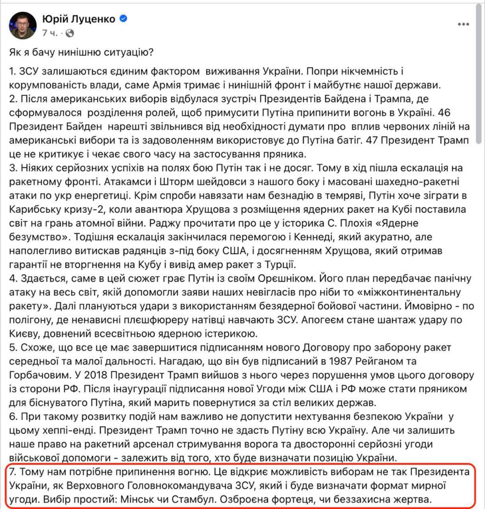 «Президент Трамп точно не сдаст Путину всю Украину. Но оставит ли наше право на ракетный арсенал сдерживания врага и двусторонние серьезные соглашения военной помощи зависит от того, кто будет определять позицию Украины. Поэтому нам нужно прекращение огня», — написал Луценко в соцсети.