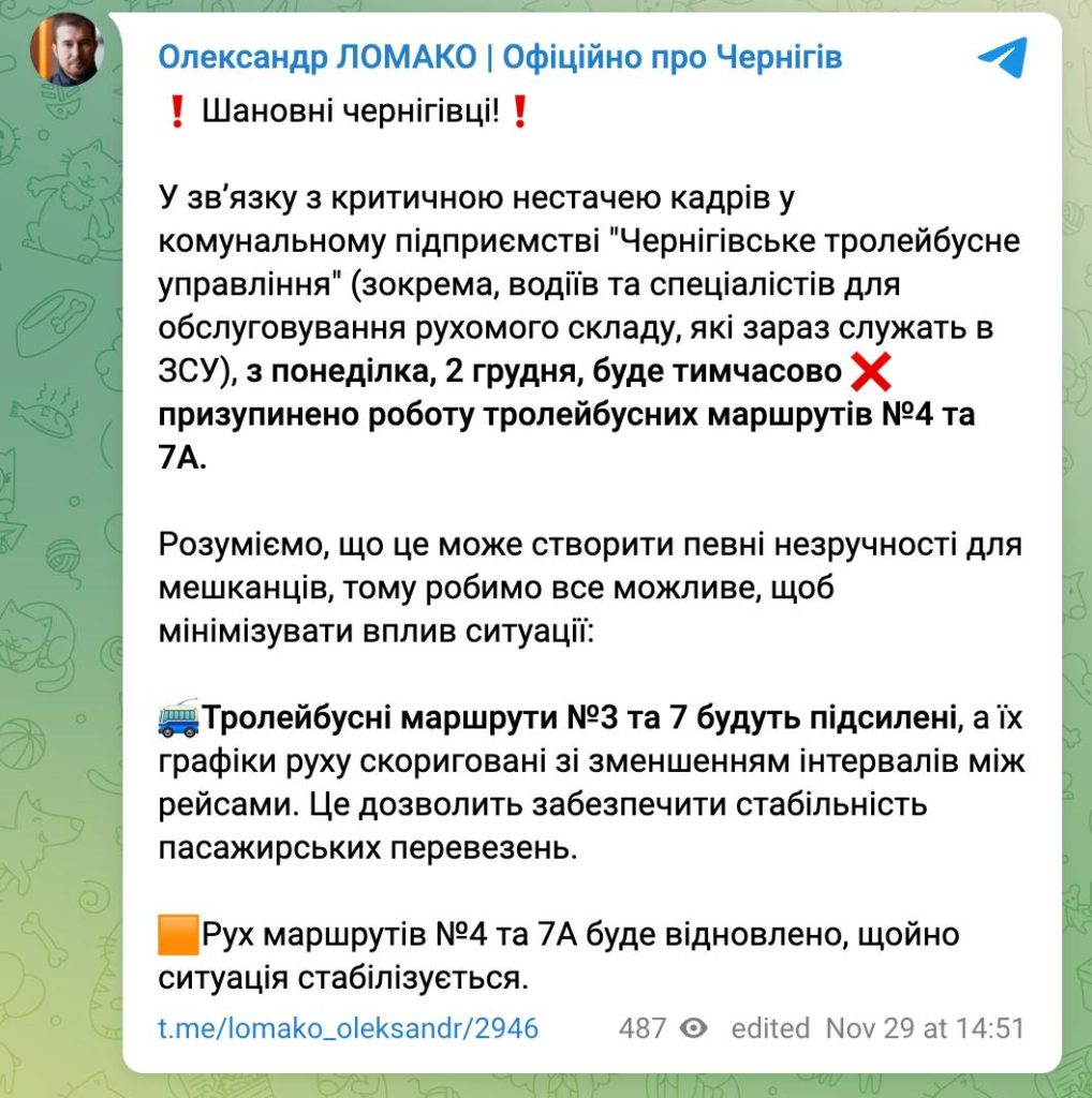 «В связи с критической нехваткой кадров в коммунальном предприятии “Черниговское троллейбусное управление”, в частности, водителей и специалистов подвижного состава, которые сейчас служат в ВСУ, с понедельника, 2 декабря, будет временно приостановлена работа троллейбусных маршрутов №4 и 7А», — написал городской глава в соцсети.