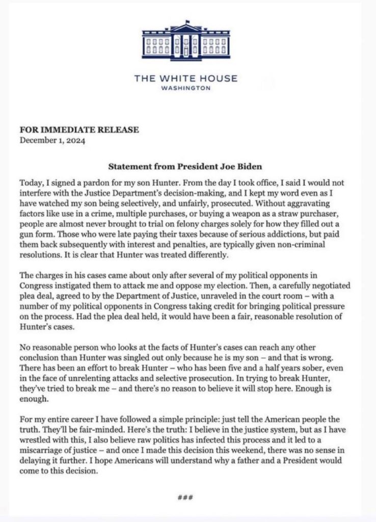 «Я подписал указ о помиловании моего сына Хантера. С того дня, как я вступил в должность, я сказал, что не буду вмешиваться в принятие решений Министерством юстиции, и я сдержал свое слово, даже когда наблюдал за тем, как моего сына избирательно и несправедливо преследуют в судебном порядке», — говорится в заявлении.